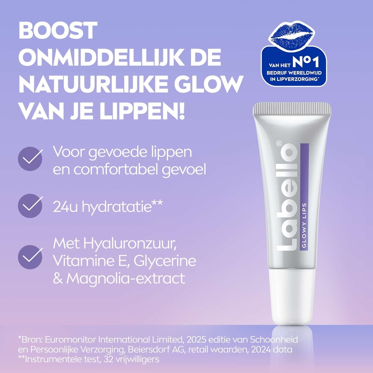 Labello Glowy Lips 10ml boost onmiddellijk de natuurlijke glow van je lippen. Onze hydraterende formule met Hyaluronzuur Vitamine E, Glycerine gecombineerd met magnolia-extract herstelt onmiddellijk de natuurlijke glow van je lippen! Het geeft 24u hydratatie* en geeft droge lippen een comfortabel gevoel en gladdere textuur. Labello is zacht voor alle huidtypen en droogt de lippen niet uit.